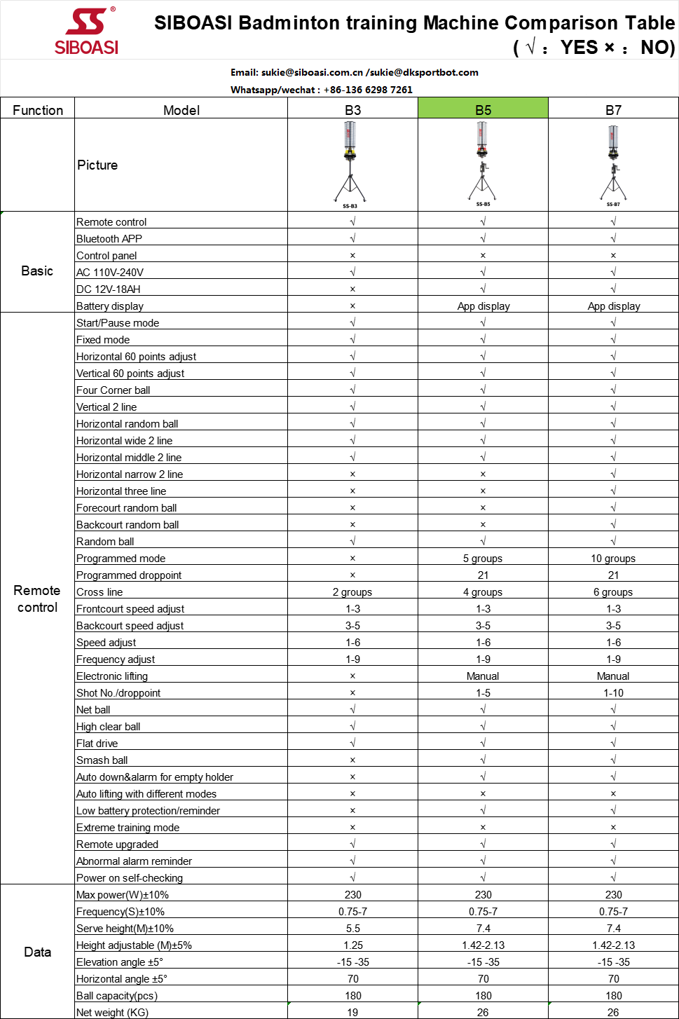 Comparison list for B3/B5/B7 badminton practice training machine models: